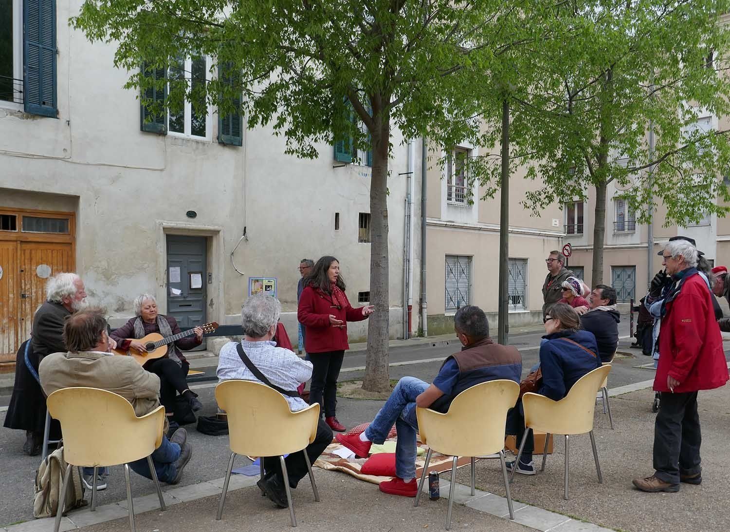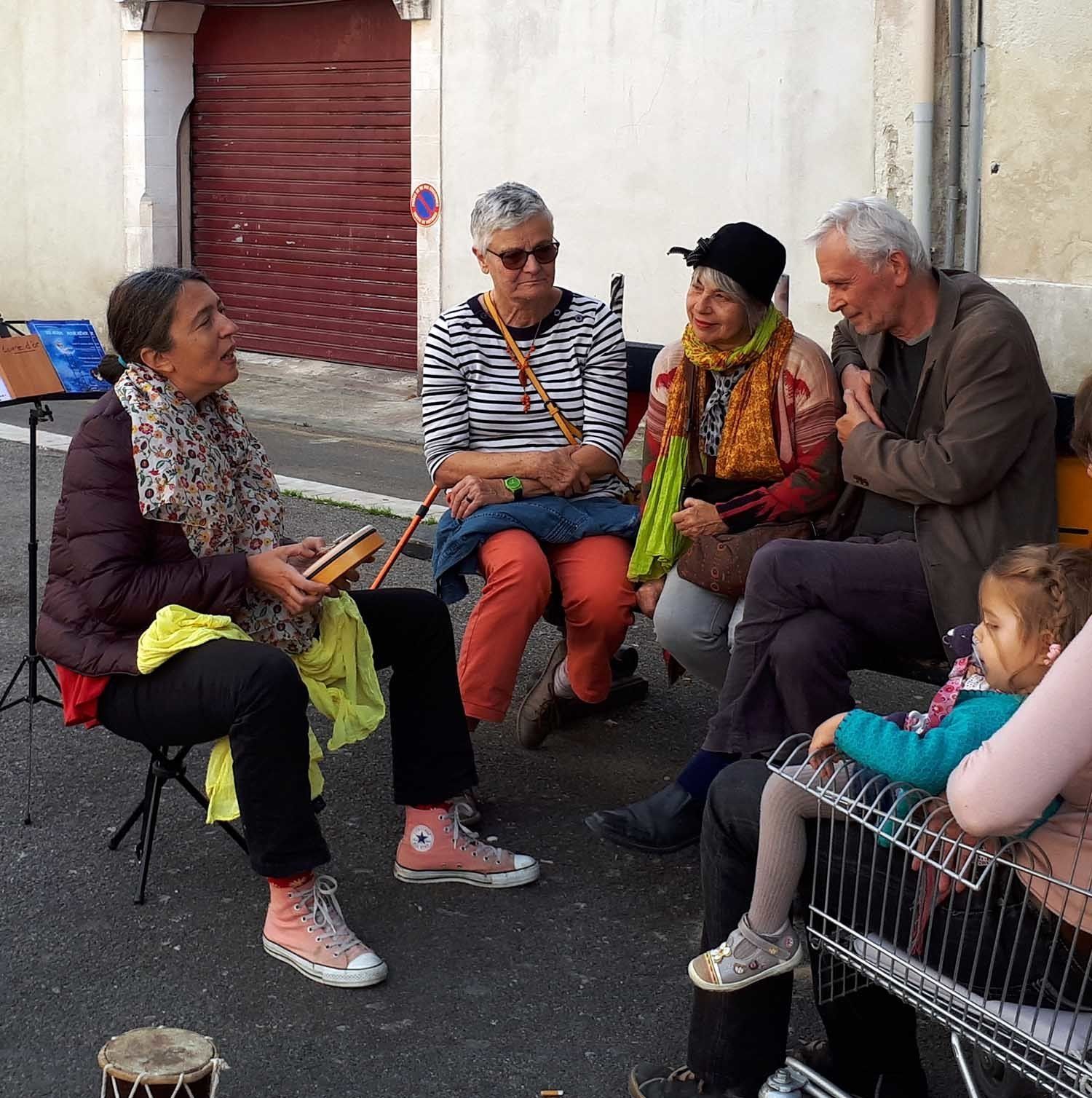 Nous partageons nos contes et nos chants lors de rendez-vous réguliers sur les places dans des quartiers « sensibles » de la ville ou auprès d'associations à caractère social (table ouverte, centre de réinsertion, centre social, café associatif ou solidaire, petit commerce, laverie, comité de quartier …).