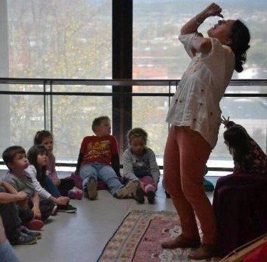 Aidées de Girafon et de la fée Capucine, histoires, berceuses et comptines sortent de la valise de la conteuse.